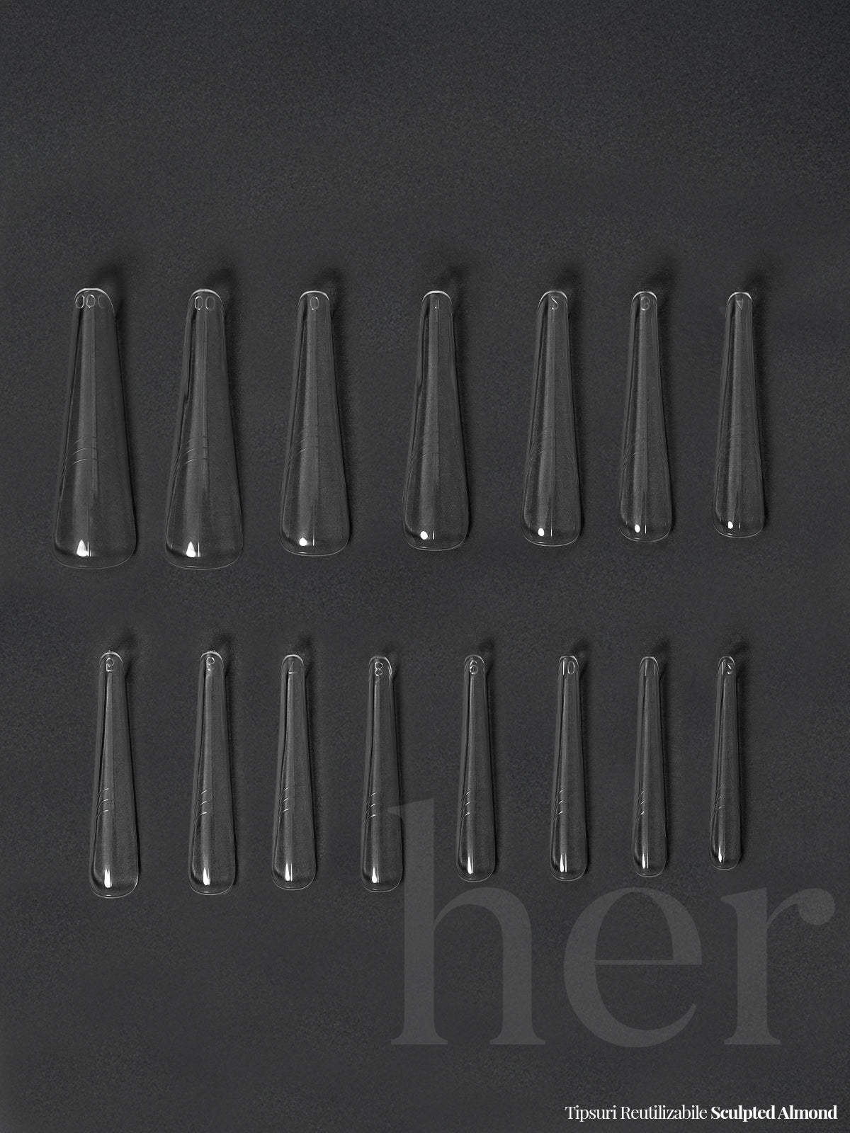 The HER Soft Edge System reusable graduated tips are made of a high-quality, flexible material, easy to use and suitable for multiple professional techniques. They are used in conjunction with HER Poly-Acrygel , HER Builder Gels , HER Liquid Poly-Acrygel or Builder Bottle .